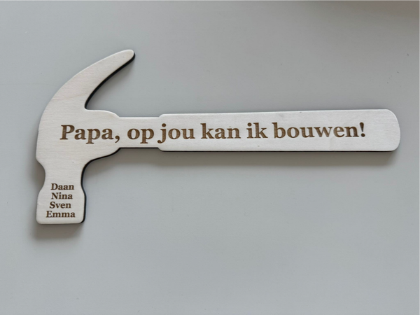 Je kunt de hamer personaliseren met de namen van de kinderen, wat het een dierbare herinnering maakt voor elke vader – perfect voor Vaderdag, een verjaardag of zomaar als blijk van waardering.
