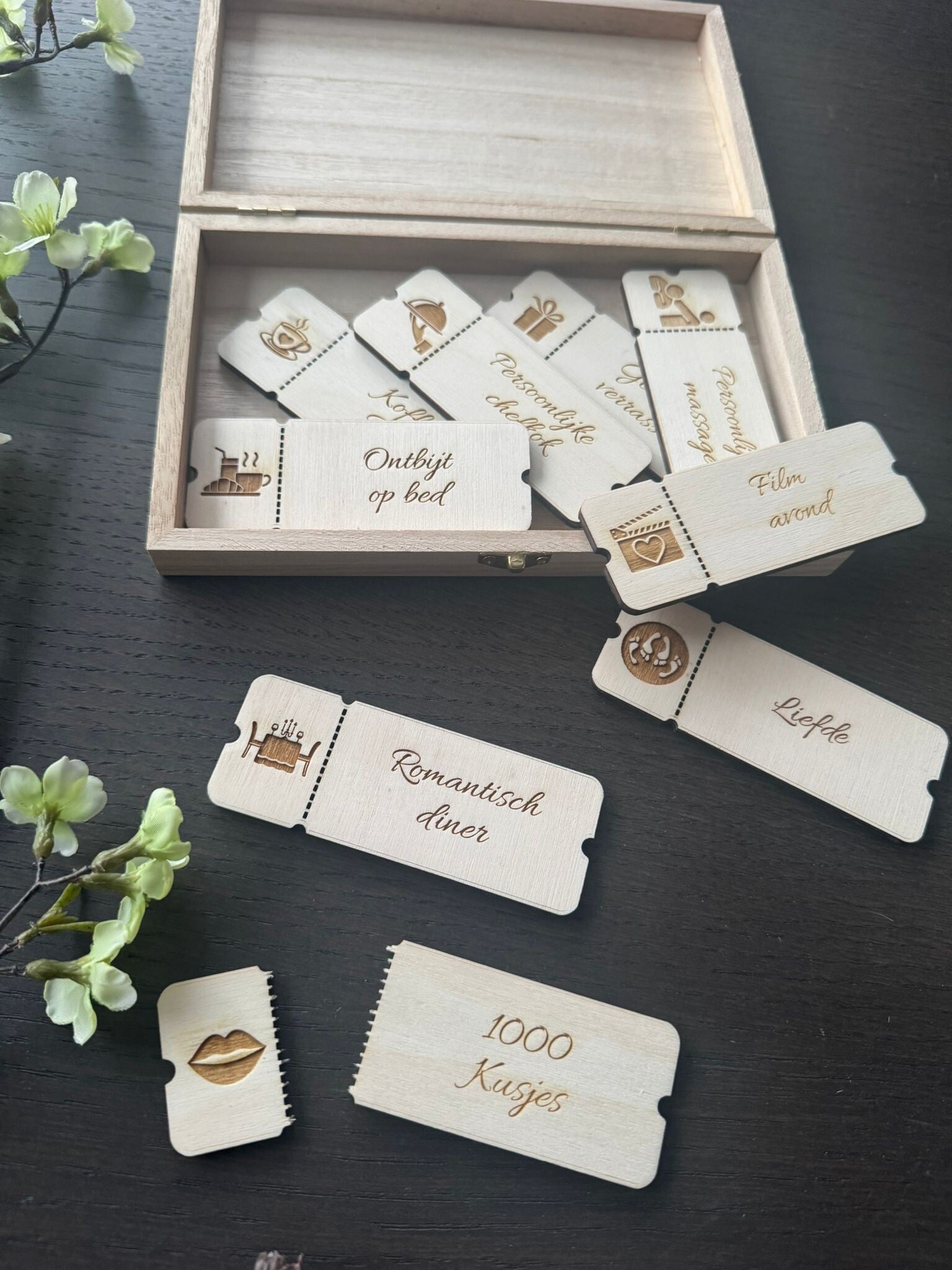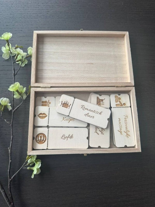 De coupons zijn gemaakt van hout en zorgvuldig gegraveerd, wat zorgt voor een natuurlijke en stijlvolle uitstraling. Een origineel cadeau om te geven aan je partner bij een speciale gelegenheid of gewoon zomaar.